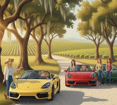 We’ll enjoy a beautiful drive, take some time to connect, laugh a lot and enjoy a well-earned glass of vino. Let’s celebrate friendship and the simple pleasure of driving.